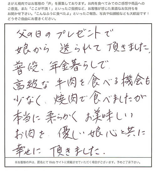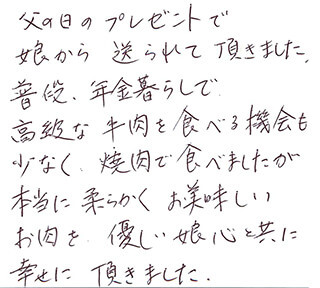 父の日のプレゼントで娘から送られて頂きました。普段、年金暮らしで、高級な牛肉を食べる機会も少なく、焼肉で食べましたが本当に柔らかくお美味しいお肉を、優しい娘心と共に幸せに頂きました。