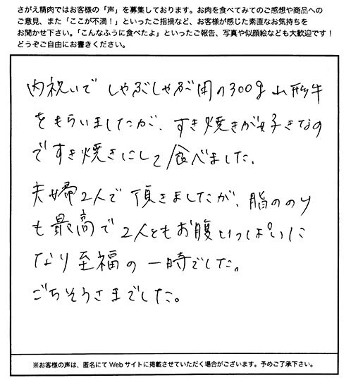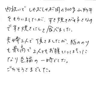 内祝いでしゃぶしゃぶ用の300g山形牛をもらいましたが、すき焼きが好きなのですき焼きにして食べました。夫婦2人で頂きましたが脂ののりも最高で2人ともお腹いっぱいになり至福の一時でした。ごちそうさまでした。