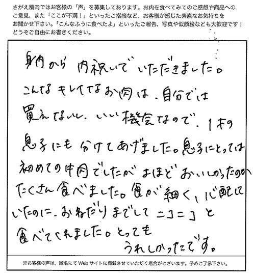 身内から内祝いでいただきました。 こんなキレイなお肉は、自分では買えないしいい機会なので、1才の息子にも分けてあげました。 息子にとっては初めての牛肉でしたがよほどおいしかったのかたくさん食べました。 食が細く、心配していたのに、おねだりまでしてニコニコと食べてくれました。 とってもうれしかったです。