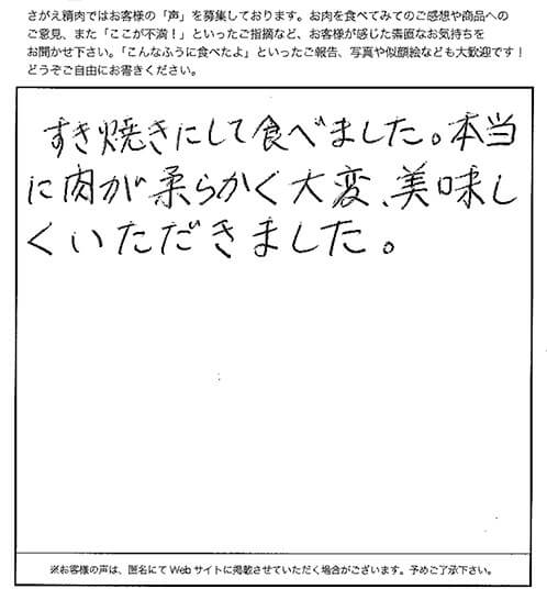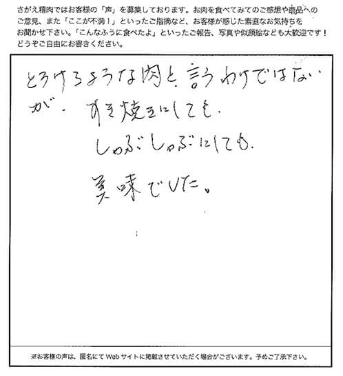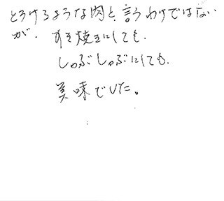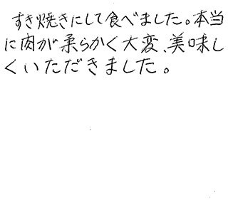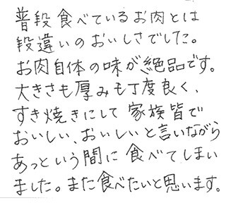 普段食べているお肉とは段違いのおいしさでした。 お肉自体の味が絶品です。 大きさも厚みも丁度良く、すき焼きにして家族皆でおいしい、おいしいと言いながらあっという間に食べてしまいました。 また食べたいと思います。