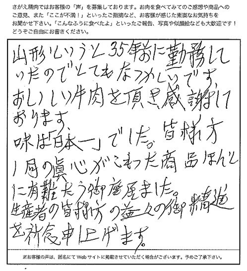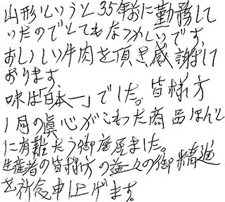 山形というと35年前に勤務していたのでとてもなつかしいです。 おいしい牛肉を頂き、感謝しております。 味は「日本一」でした。皆様方一同の眞心がこもった商品ほんとに有難う御座いました。 生産者の皆様方のますますの御精進を祈念申し上げます。