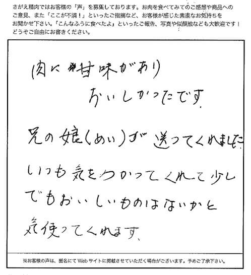 肉に甘味がありおいしかったです。 兄の娘(めい)が送ってくれました。 いつも気をつかってくれて少しでもおいしいものはないかと気使ってくれます。