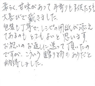 柔かく、甘味があって年寄りも子供たちも大喜びで戴きました。 包装も丁寧でレシピの用紙が添えてあるのもとてもよいと思います。 お祝いのお返しに送って頂いたのですが、こういう贈り物もありだと納得しました。