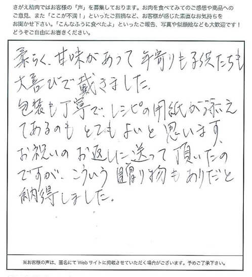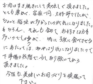 お客さまの声や口コミ・レビューをご紹介いたします。お寄せいただいた温かいお言葉を励みに、もっと、もっと、ご満足いただけるお肉をご提供できるよう努めてまいります。