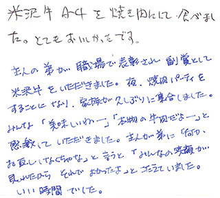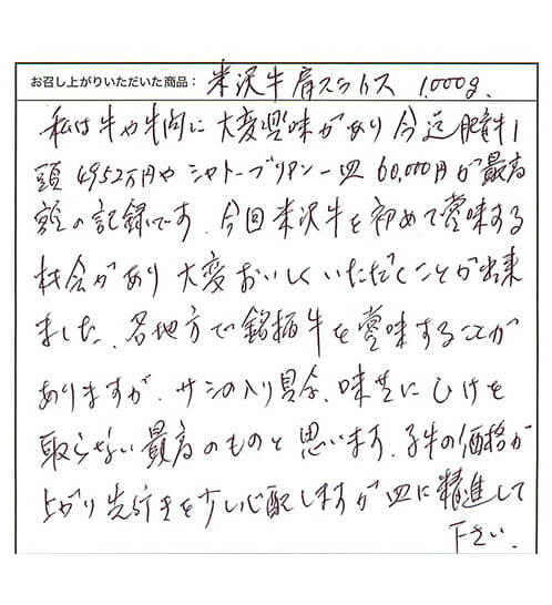 私は牛や牛肉に大変興味があり今まで肥育牛1頭4952万円やシャトーブリアン一皿60,000円が最高額の記録です。今回米沢牛を初めて愛味する機会があり大変おいしくいただくことが出来ました。各地方で銘柄牛を愛味することがありますが、サシの入り具合、味共にひけを取らない最高のものと思います。子牛の価格が上がり先行きを少し心配しますが更に精進して下さい。