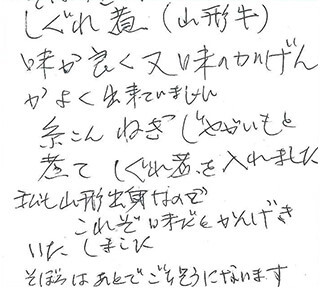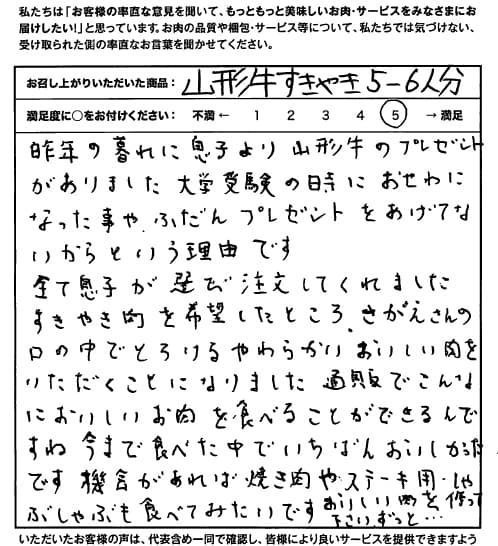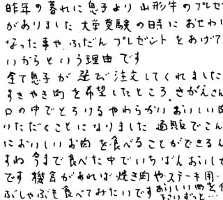 息子夫婦から誕生日のお祝いに頂きました。レシピが付いていましたのでその通りに調理したら、まぁ、とてもやわらかで存在感のある味わいでした。 年齢と共にお肉を敬遠しがちですがとても満足のいく食事になりました。 息子夫婦にも、さがえでお仕事をされている方にもとても感謝の気持で一杯です。ありがとうございました