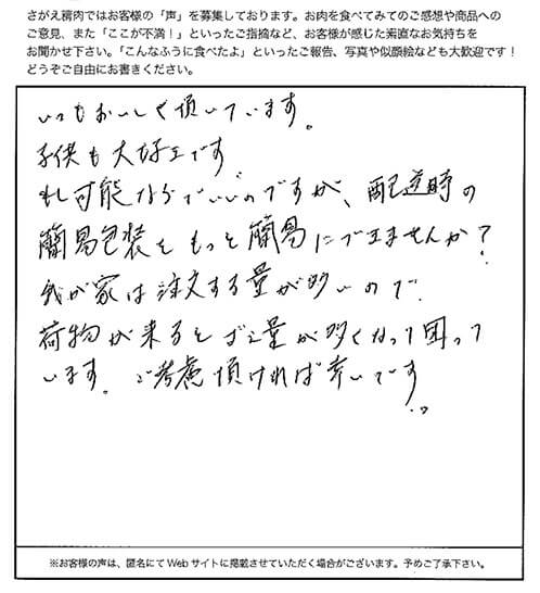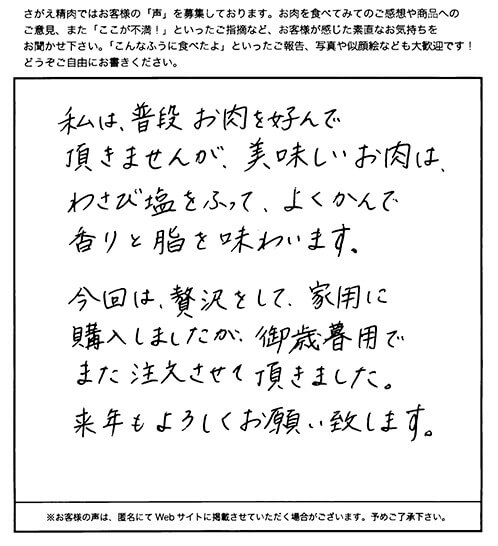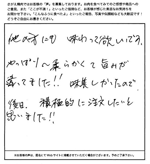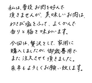 お客さまの声や口コミ・レビューをご紹介いたします。お寄せいただいた温かいお言葉を励みに、もっと、もっと、ご満足いただけるお肉をご提供できるよう努めてまいります。