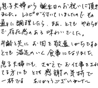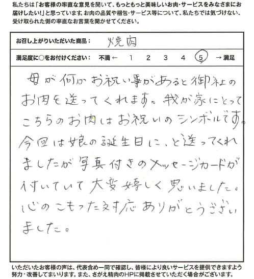 母が何かお祝い事があると御社のお肉を送ってくれます。我が家にとってこちらのお肉はお祝いのシンボルです。今回は娘の誕生日に、と送ってくれましたが写真付きのメッセージカードが付いていて大変嬉しく思いました。心のこもった対応ありがとうございました。