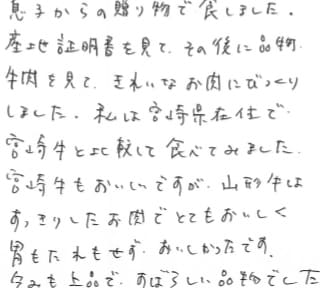 息子からの贈り物で食しました。産地証明書を見て、その後に品物、牛肉を見て、きれいなお肉にびっくりしました。私は宮崎県在住で宮崎牛と比較して食べてみました。宮崎牛もおいしいですが、山形牛はすっきりしたお肉でとてもおいしく胃もたれもせず、おいしかったです。 包みも上品で、すばらしい品物でした。