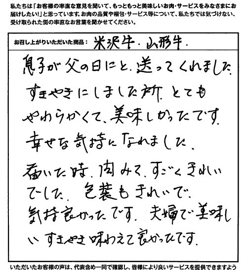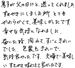 息子が父の日にと、送ってくれました。すきやきにしました所、とてもやわらかくて、美味しかったです。幸せな気持になれました。届いた時、肉見て、すごくきれいでした。包装もきれいで、気持良かったです。夫婦で美味しいすきやき味わえて良かったです。