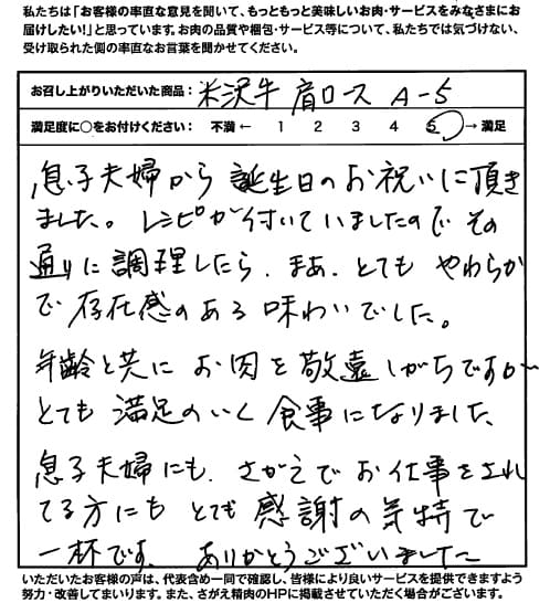 息子夫婦から誕生日のお祝いに頂きました。レシピが付いていましたのでその通りに調理したら、まぁ、とてもやわらかで存在感のある味わいでした。 年齢と共にお肉を敬遠しがちですがとても満足のいく食事になりました。 息子夫婦にも、さがえでお仕事をされている方にもとても感謝の気持で一杯です。ありがとうございました