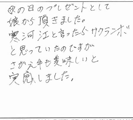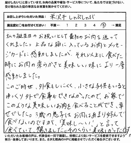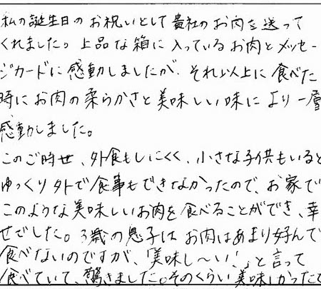私の誕生日のお祝いとして貴社のお肉を送ってくれました。上品な箱に入っているお肉とメッセージカードに感動しましたが、それ以上に食べた時にお肉の柔らかさと美味しい味により一層感動しました。このご時世、外食もしにくく、小さな子供もいるとゆっくり外で食事もできなかったので、お家でこのような美味しいお肉を食べることができ、幸せでした。3歳の息子はお肉はあまり好んで食べないのですが、「美味し〜い!」と言って食べていて、驚きました。そのくらい美味しかったです。