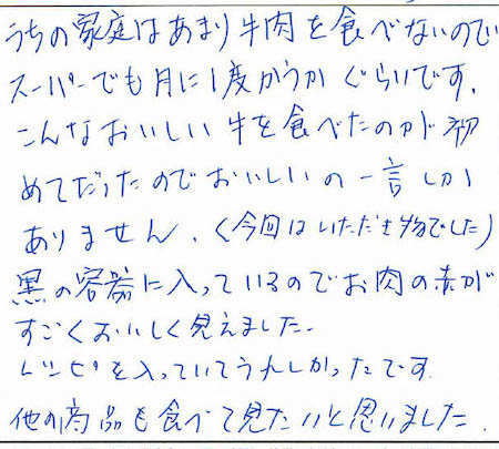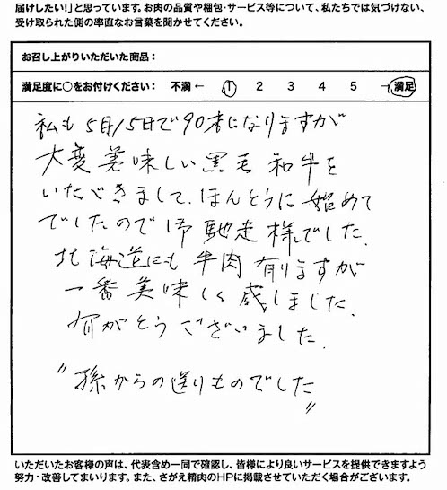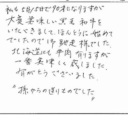 私も5月15日で90才になりますが大変美味しい黒毛和牛をいただきまして、ほんとうに初めてでしたので御馳走様でした。北海道にも牛肉有りますが一番美味しく感じました。有がとうございました。”孫からの贈りものでした”