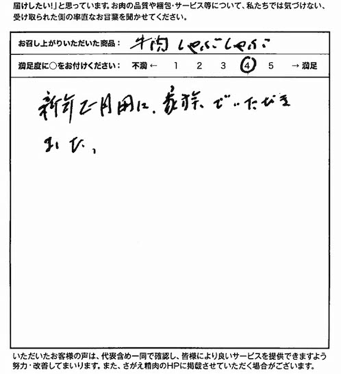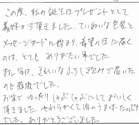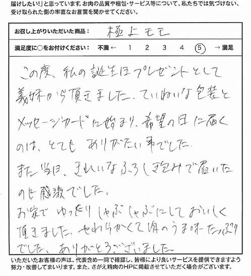 この度、私の誕生日プレゼントとして義妹からいただきました。ていねいな包装とメッセージカードに始まり、希望の日に届くのは、とてもありがたい事でした。また当日、きれいなふろしき包みで届いたのに感激でした。お家でゆったりしゃぶしゃぶにしておいしく頂きました。やわらかくて肉のうま味たっぷりでした。ありがとうございました。