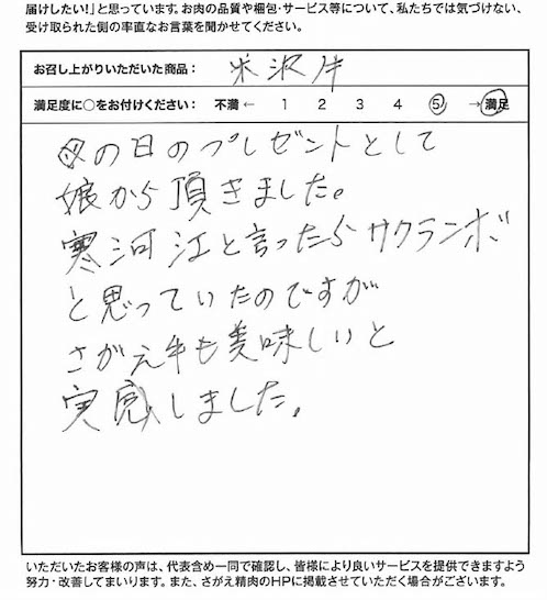 母の日のプレゼントとして娘から頂きました。寒河江と言ったらサクランボと思っていたのですがさがえ牛も美味しいと実感しました。