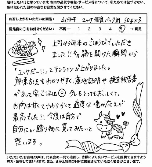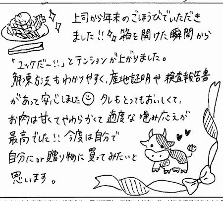 お客さまの声や口コミ・レビューをご紹介いたします。お寄せいただいた温かいお言葉を励みに、もっと、もっと、ご満足いただけるお肉をご提供できるよう努めてまいります。
