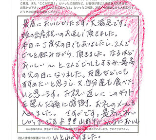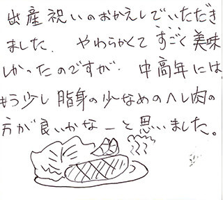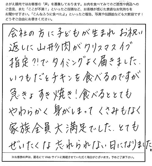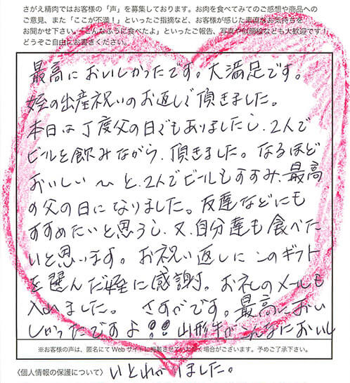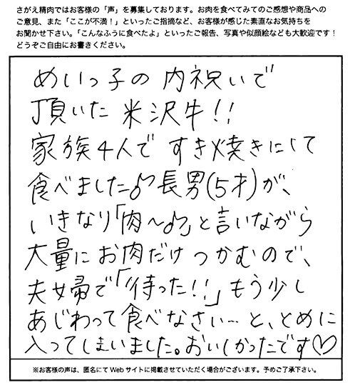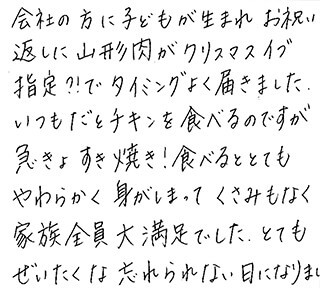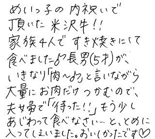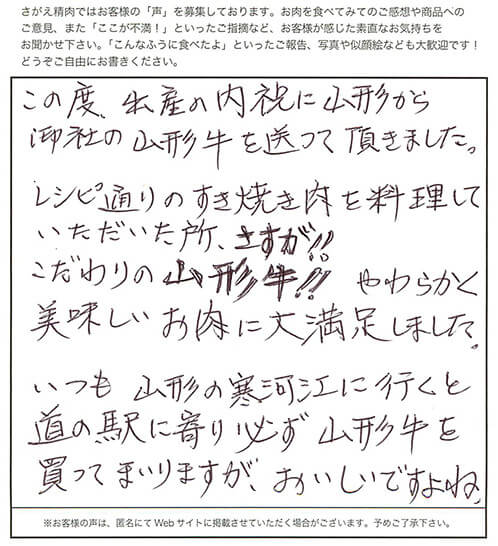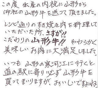 この度、出産の内祝に山形から御社の山形牛を送って頂きました。レシピ通りのすき焼き肉を料理していただいた所、さすが!!こだわりの山形牛!!やわらかく美味しいお肉に大満足しました。いつも山形の寒河江に行くと道の駅に寄り必ず山形牛を買ってまいりますが、おいしいですよね。