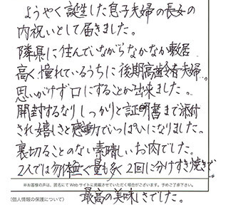 お客さまの声や口コミ・レビューをご紹介いたします。お寄せいただいた温かいお言葉を励みに、もっと、もっと、ご満足いただけるお肉をご提供できるよう努めてまいります。