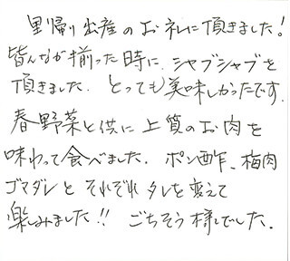 里帰り出産のお礼に頂きました!【しゃぶしゃぶ/出産内祝い】