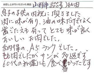 息子の子供の内祝いに頂きました 肉に味が有り、油の味だけでなく歯ごたえも有ってとても味が良くおいしいお肉でした。納得のA5ランクでした。もも肉でしたがサシが多過ぎず60代の私達にも食べ易かったです