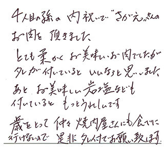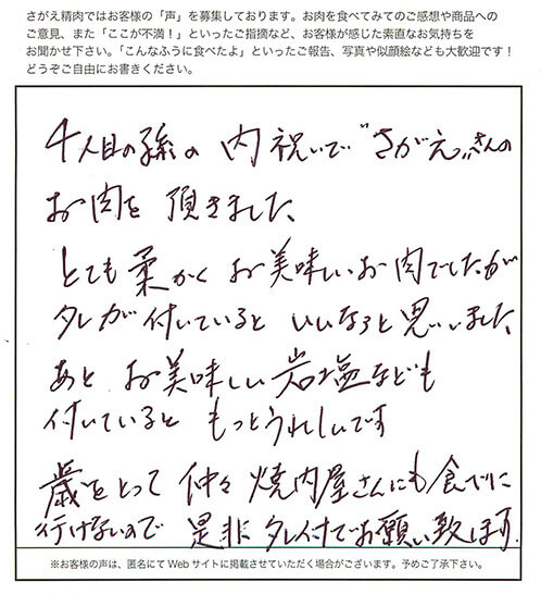 4人目の孫の内祝いで“さがえ”さんのお肉を頂きました とても柔かくお美味しいお肉でしたがタレが付いているといいなァと思いました あと、お美味しい岩塩なども付いているともっとうれしいです 歳をとって仲々焼肉屋さんにも食べに行けないので是非タレ付でお願い致します。