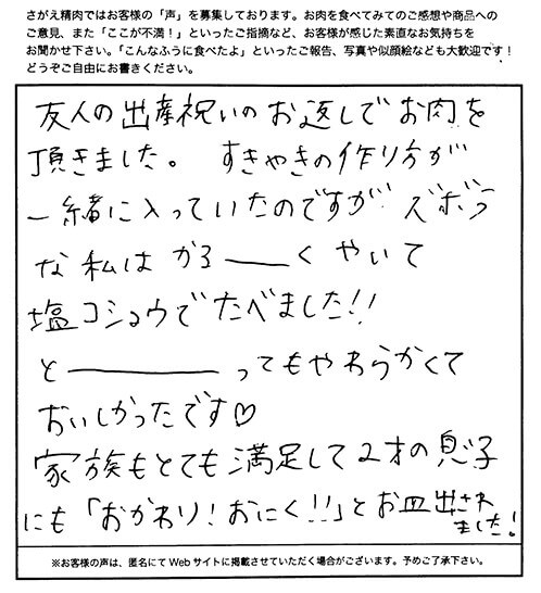 友人の出産祝いのお返しでお肉を頂きました。すきやきの作り方が一緒に入っていたのですが、ズボラな私はかるーくやいて塩コショウで食べました!!とーってもやわらかくておいしかったです。家族もとても満足して2才の息子にも「おかわり!おにく!!」とお皿出されました!