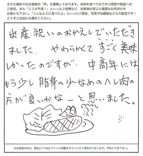出産祝いのおかえしでいただきました。やわらかくてすごく美味しかったのですが、中高年にはもう少し脂身の少なめのヘレ肉の方が良いかなーと思いました。