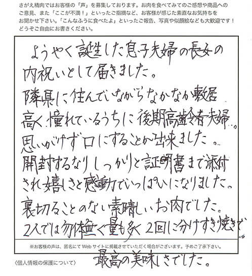 ようやく誕生した息子夫婦の長女の内祝いとして届きました。隣県に住んでいながらなかなか敷居高く、憧れているうちに後期高齢者夫婦..。思いがけず口にすることが出来ました。..開封するなりしっかりと証明書まで添付され、嬉しさと感動でいっぱいになりました。裏切ることのない素晴らしいお肉でした。2人では勿体無く量も多く2回に分けすき焼きで最高の美味しさでした。