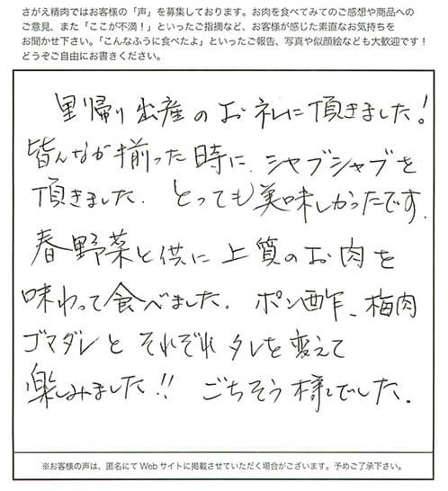 里帰り出産のお礼に頂きました!皆んなが揃った時に、シャブシャブを頂きました。とっても美味しかったです。春野菜と共に上質のお肉を味わって食べました。ポン酢、梅肉ゴマダレとそれぞれタレを変えて楽しみました!!ごちそう様でした。