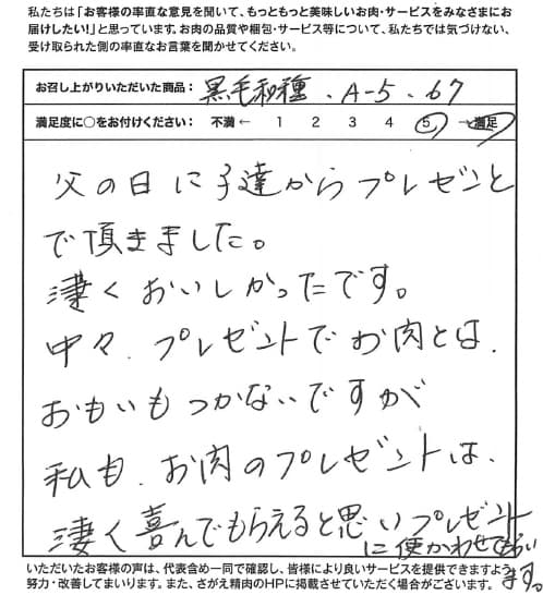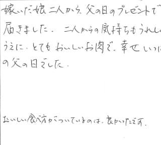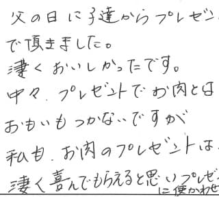 父の日に子ども達からプレゼントとして頂きました。凄くおいしかったです。なかなかプレゼントでお肉とは思いもつかないですが、私もお肉のプレゼントは凄く喜んでもらえると思い、プレゼントに使わせてもらいます。