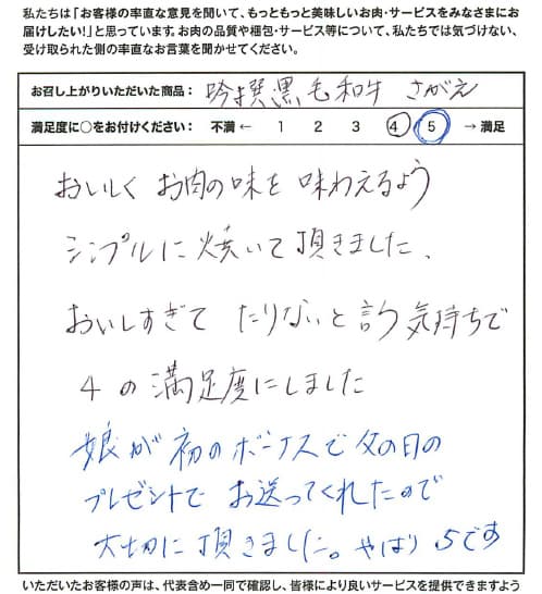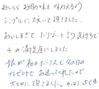 おいしくお肉の味を味わえるようシンプルに焼いて頂きました。おいしすぎてたりないという気持ちで☆4の満足度にしました。娘が初のボーナスで父の日のプレゼントで送ってくれたので大切に頂きました。やはり☆5です。