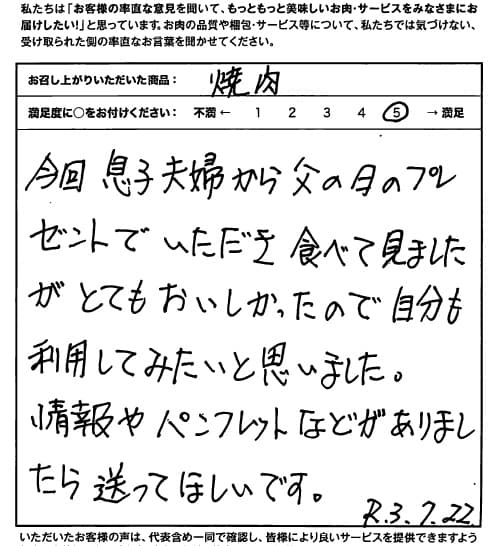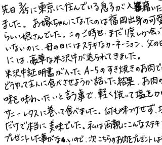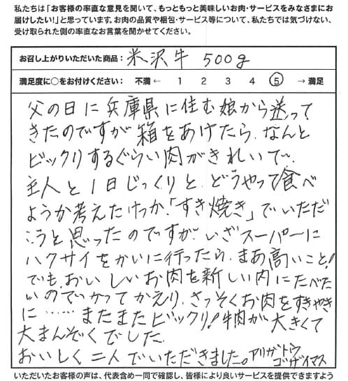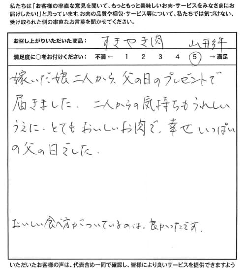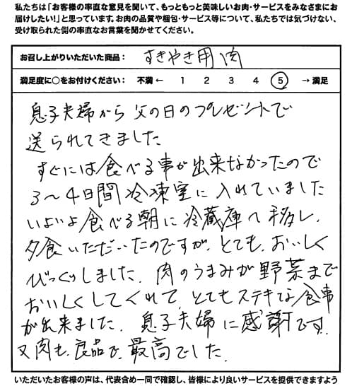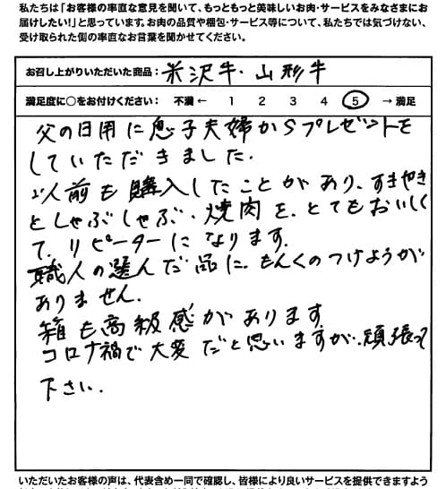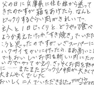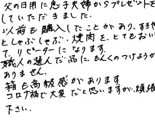 父の日用に息子夫婦からプレゼントをしていただきました。 以前も購入したことがあり、すきやきとしゃぶしゃぶ、焼肉を、とてもおいしくてリピーターになります。 職人の選んだ品にもんくのつけようがありません。 箱も高級感があります。 コロナ禍で大変だと思いますが、頑張って下さい。