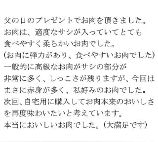 父の日のプレゼントでお肉を頂きました。 お肉は、適度なサシが入っていてとても食べやすく柔らかいお肉でした。 (お肉に弾力があり、食べやすいお肉でした) 一般的に高級なお肉がサシの部分が非常に多く、しっこさが残りますが、今回はまさに赤身が多く私好みのお肉でした。 次回、自宅用に購入してお肉本来のおいしさを再度味わいたいと考えています。 本当においしいお肉でした。(大満足です)