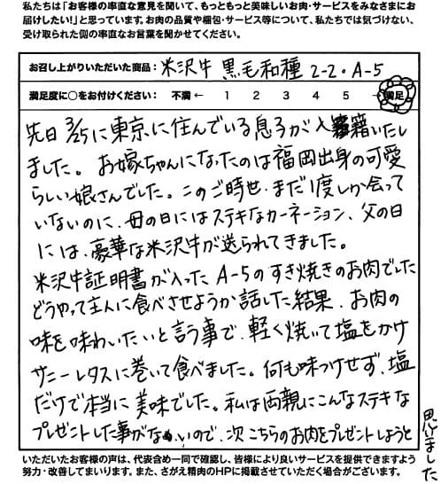 先日3/25に東京に住んでいる息子が入籍いたしました。 お嫁ちゃんになったのは福岡出身の可愛らしい娘さんでした。 このご時世、まだ1度しか会っていないのに、母の日にはステキなカーネーション、父の日には豪華な米沢牛が送られてきました。 米沢牛証明書が入ったA5のすき焼きのお肉でした。 どうやって主人に食べさせようか話した結果、お肉の味を味わいたいという事で、軽く焼いて塩をかけサニーレタスに巻いて食べました。 何も味付けせず塩だけで本当に美味でした。 私は両親にこんなステキなプレゼントをした事がないので、次こちらのお肉をプレゼントしようと思いました。
