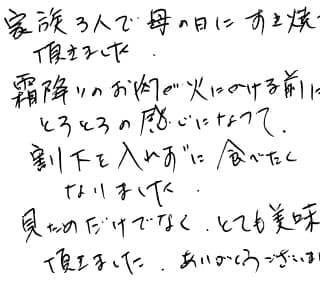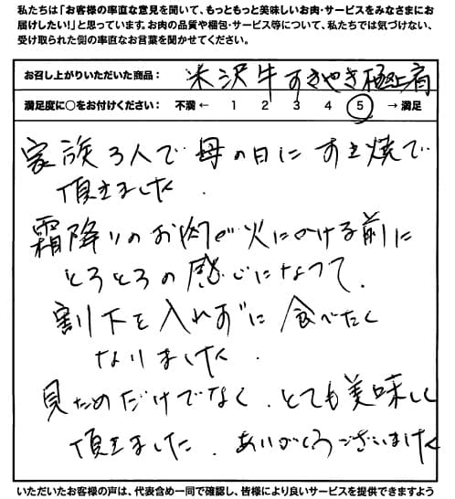 家族3人で母の日にすき焼きで頂きました。 霜降りのお肉が火にかける前にとろとろの感じになって、割り下を入れずに食べたくなりました。 見ためだけでなく、とても美味しく頂きました。 ありがとうございました。