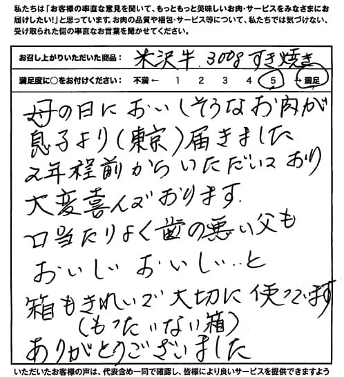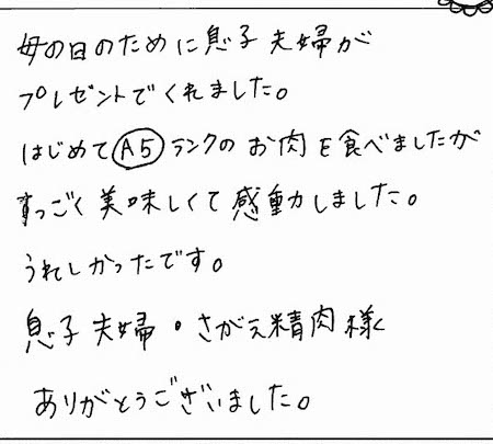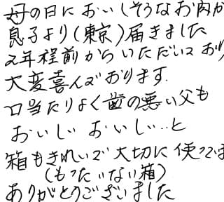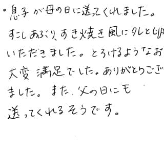 母の日においしそうなお肉が息子より(東京)届きました。 2年程前からいただいており大変喜んでおります。 口当たりよく歯の悪い父もおいしいおいしいと。 箱もきれいで大切に使っています。 ありがとうございました。