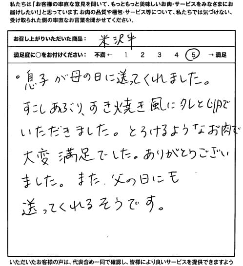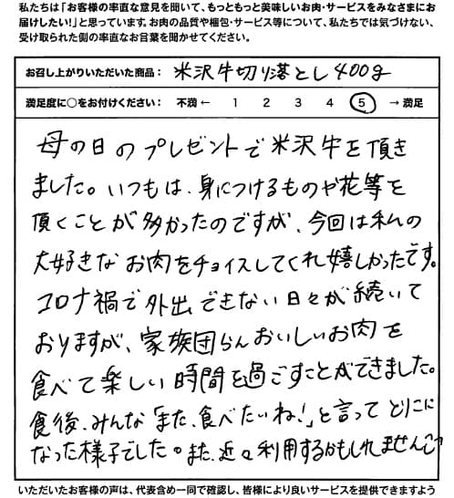 母の日のプレゼントで米沢牛を頂きました。 いつもは身につけるものや花等を頂くことが多かったのですが、今回は私の大好きなお肉をチョイスしてくれ嬉しかったです。 コロナ禍で外出できない日々が続いておりますが、家族団らんおいしいお肉を食べて楽しい時間を過ごすことができました。 食後、みんな「また、食べたいね!」と言ってとりこになった様子でした。また近々利用するかもしれません。