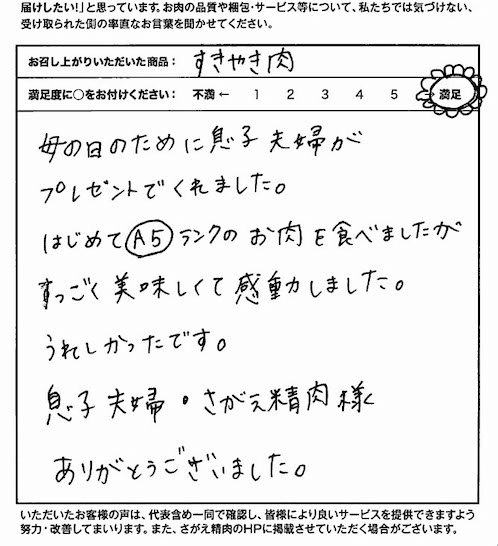 母の日のために息子夫婦がプレゼントでくれました。はじめてA5ランクのお肉を食べましたがすっごく美味しくて感動しました。うれしかったです。息子夫婦・さがえ精肉様ありがとうございました。