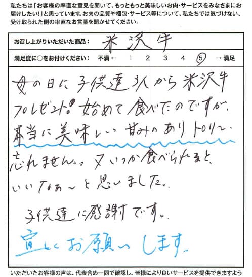 母の日に子供達3人から米沢牛プレゼント! 始めて食べたのですが、本当に美味しい甘みのありトロリ〜忘れません。 又、いつかたべれるといいなぁ〜と思いました。 子供達に感謝です。
