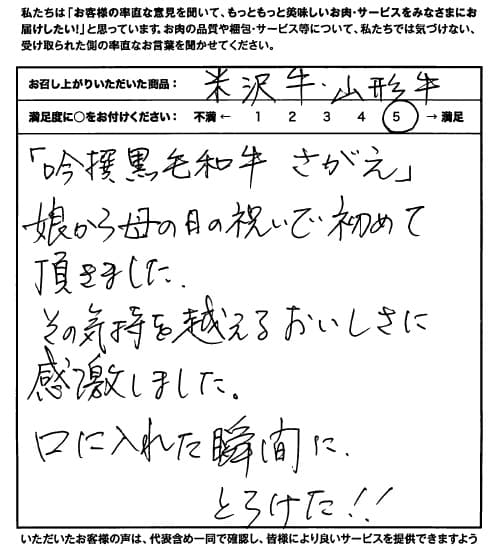 「吟撰黒毛和牛さがえ」 娘から母の日の祝いで初めて頂きました。 その気持を越えるおいしさに感激しました。 口に入れた瞬間にとろけた!!