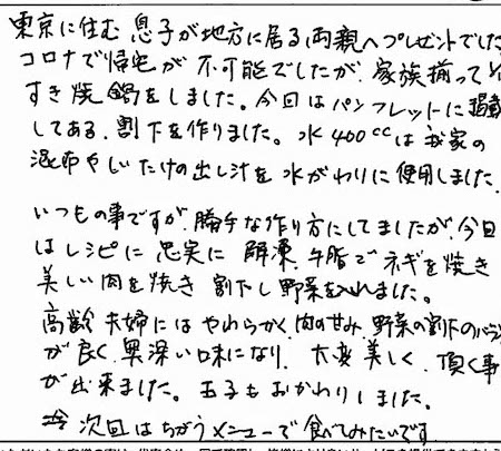 東京に住む息子が地方に居る両親へプレゼントでした。コロナで帰宅が不可能でしたが、家族揃って1/1にすき焼鍋をしました。今回はパンフレットに掲載してある、割下を作りました。水400ccは我家の昆布やしいたけの出し汁を水がわりに使用しました。いつもの事ですが、勝手な作り方にしてましたが、今回はレシピに忠実に解凍、牛脂でネギを焼き美味しい肉を焼き割下と野菜を入れました。高齢夫婦にはやわらかく、肉の甘味、野菜の割下のバランスが良く、奥深い味になり、大変美しく頂く事が出来ました。玉子もおかわりしました。次回はちがうメニューで食べてみたいです。