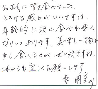 お正月に皆で食べました。とろける感じがいいですね。年齢的に沢山食べれ無くなりつつあります。美味しい物を少し、食べるのがぜい沢ですね。これからも宜しくお願いします。妻 明美より