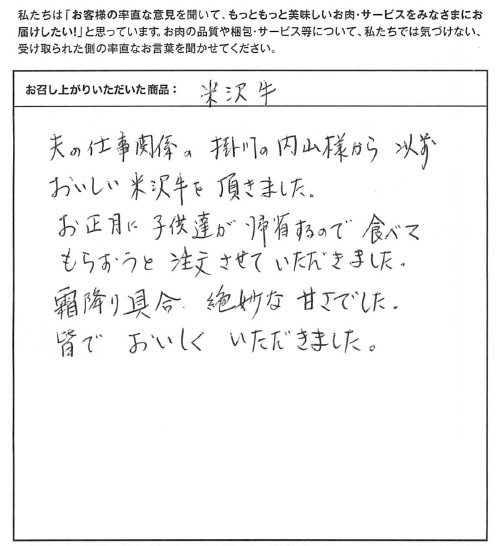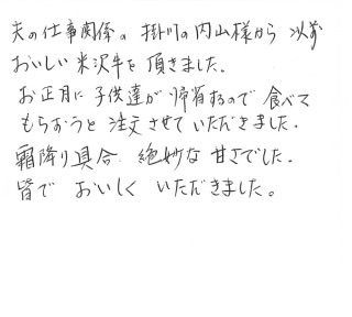 夫の仕事関係の掛川の内山様から以前おいしい米沢牛を頂きました。お正月に子供達が帰省するので食べてもらおうと注文させていただきました。霜降り具合、絶妙な甘さでした。皆でおいしくいただきました。