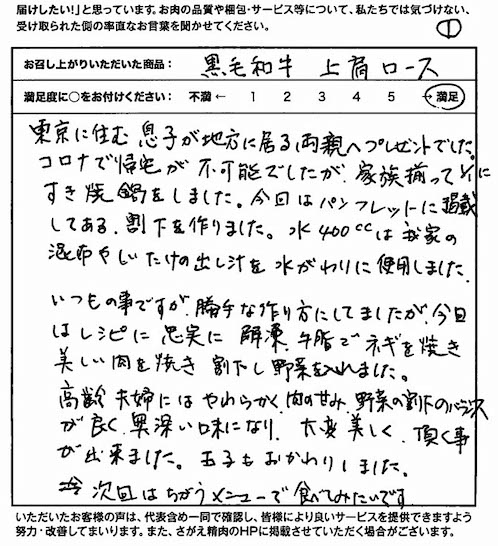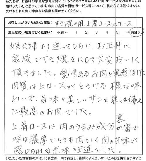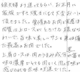 娘夫婦より送ってもらい、お正月に家族ですき焼きにして大変おいしく頂きました。愛情あるお肉と実感しました。肉質は上ロースがとろける様な味わいで、旨味と美しいサシを兼ね備えた最高のお肉でした。上肩ロースは、肉のうまみ成分が豊富で味は濃厚でとても肉々しく肉の甘味が感じられる赤身の王道でした。