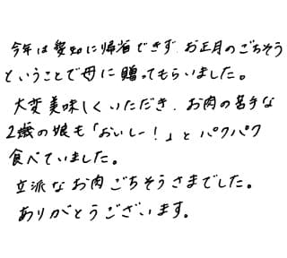 今年は愛知に帰省できず、お正月のごちそうということで母に贈ってもらいました。大変美味しくいただき、お肉の苦手な2歳の娘も「おいしー!」とパクパク食べていました。立派なお肉ごちそうさまでした。ありがとうございます。