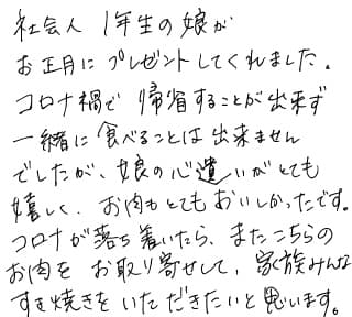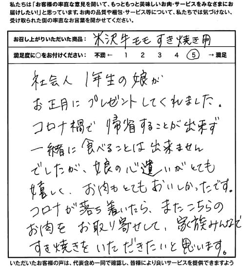 社会人1年生の娘がお正月にプレゼントしてくれました。 コロナ禍で帰省することが出来ず、一緒に食べることは出来ませんでしたが、娘の心遣いがとても嬉しく、お肉もとてもおいしかったです。 コロナが落ち着いたら、またこちらのお肉をお取り寄せして、家族みんなですき焼きをいただきたいと思います。