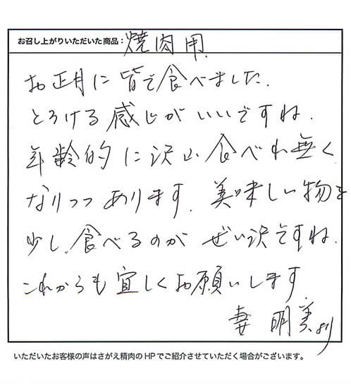 お客さまの声や口コミ・レビューをご紹介いたします。お寄せいただいた温かいお言葉を励みに、もっと、もっと、ご満足いただけるお肉をご提供できるよう努めてまいります。