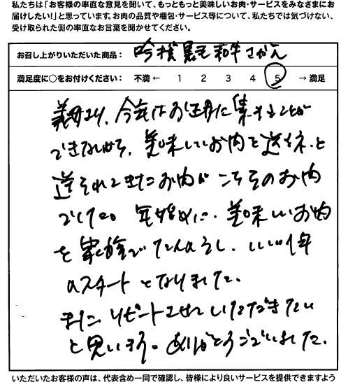 義母より、今年はお正月に集まることができないから、美味しいお肉を送るネと送られてきたお肉が、こちらのお肉でした。年初めに、美味しいお肉を家族で堪能し、いい1年のスタートとなりました。また、リピートさせて頂きたいと思います。ありがとうございました。