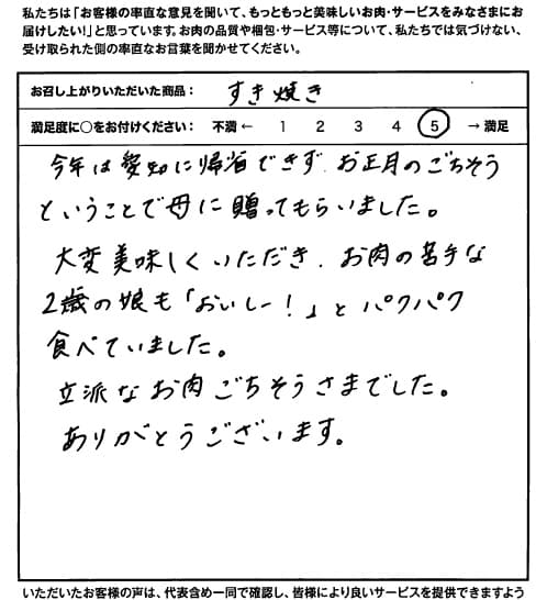 今回初めて注文させてもらいました。家族とお正月に食べるすきやき用でいただきました。とても美味しくて、家族と共に驚きながら感動しながら食べさせてもらいました。また来年のお正月や特別な時にはこちらでお願いさせていただきます。梱包も丁寧ですごく嬉しかったです。今後ともよろしくお願い致します。