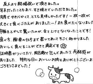 結婚のお祝いでいただきました。証明書が入っていたのが良かったです。特別感が伝わりました。また、レシピが複数のっていたのも参考にして作れたので助かりました。→ただ、レシピは、そのお肉に該当するレシピだけの方が見やすくて良かったかなとも思いました。 でも、とっても美味しくて大満足でした!